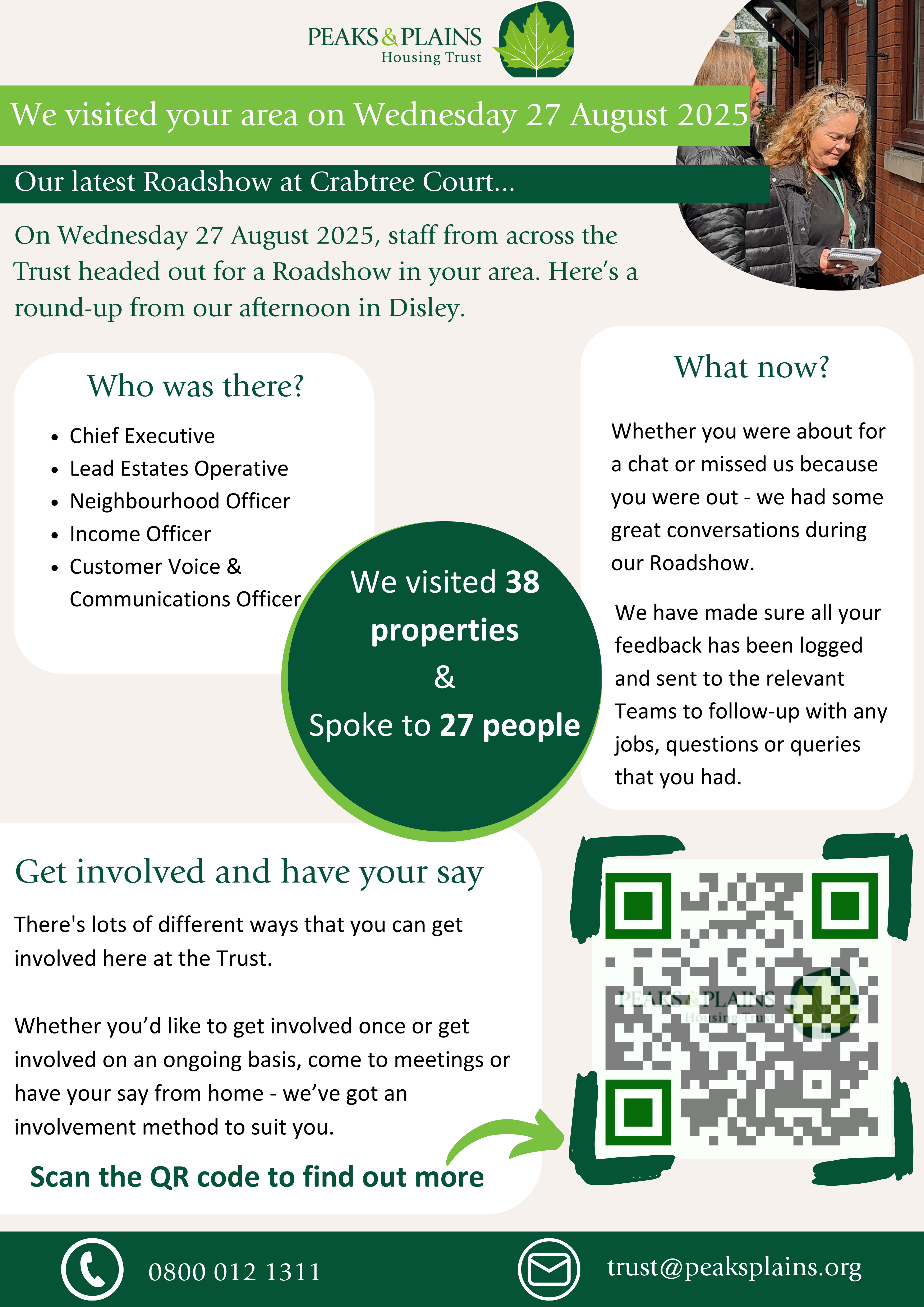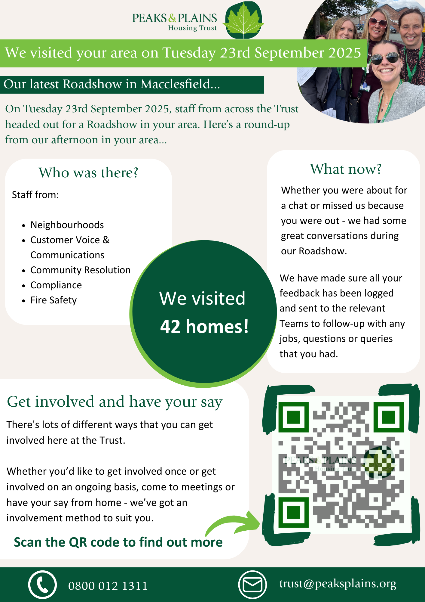 Roadshows see staff from across the Trust heading out to say hello. We knock on and check-in on how you are doing - giving you the chance to give us feedback or report any repairs or other issues.